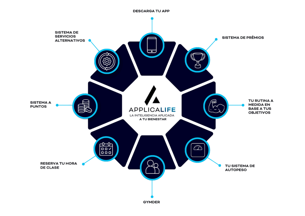 Rutina, seguimiento, reservas, puntos, premios, comunidad y servicios complementarios.